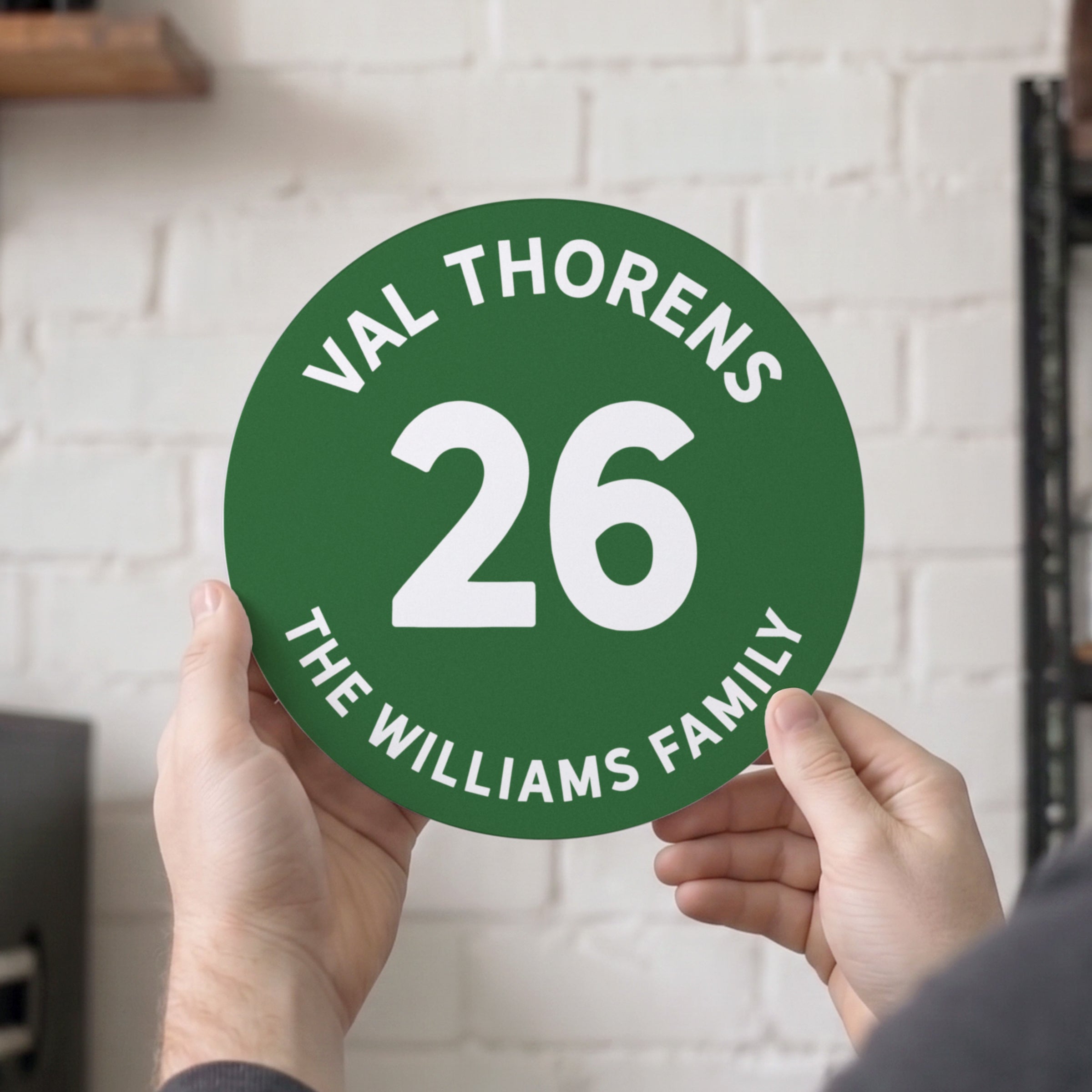 This circular metal print features a ski piste marker design in your choice of ski run colour. Personalise with your favourite ski location, number and line of text. The design is printed straight onto an aluminium sign.