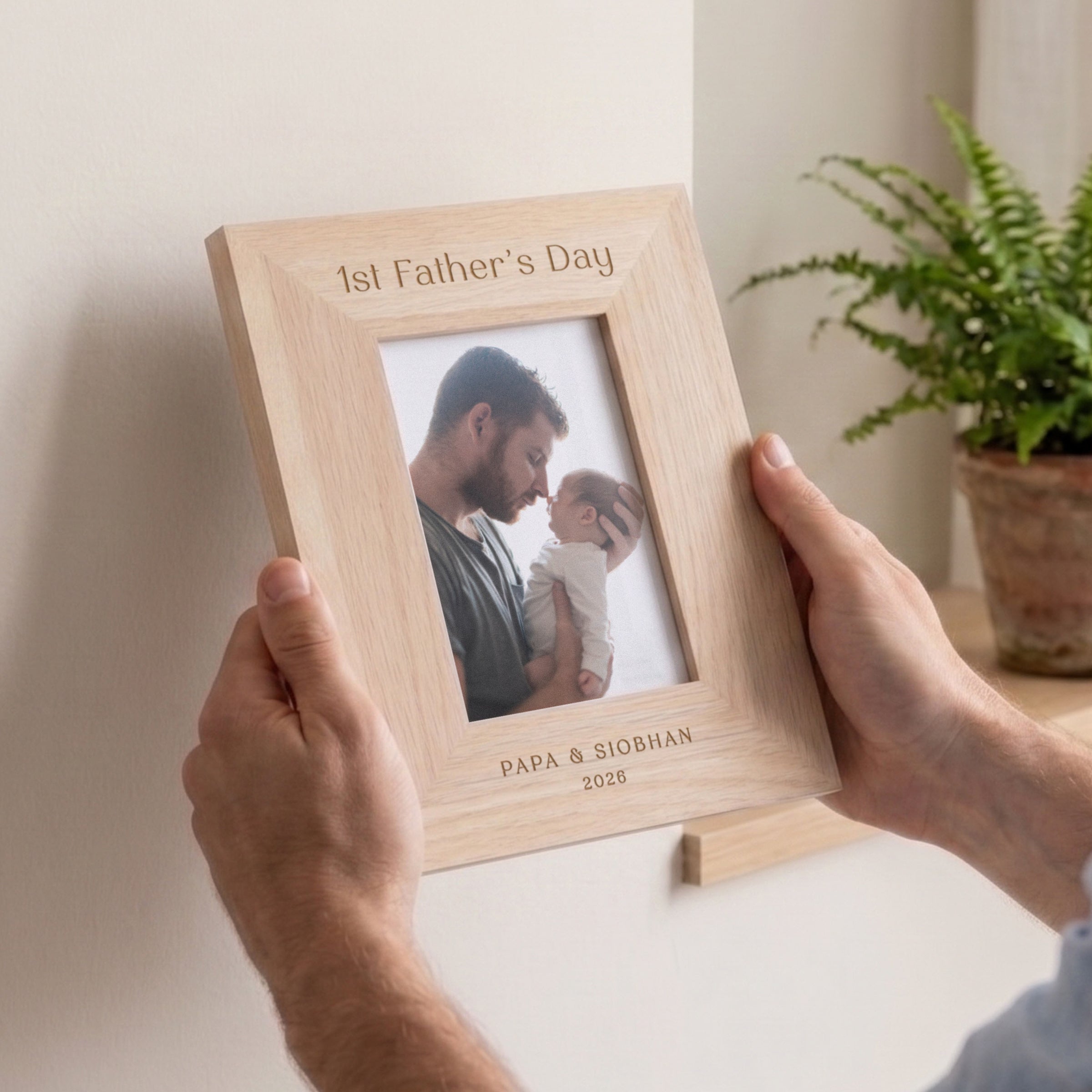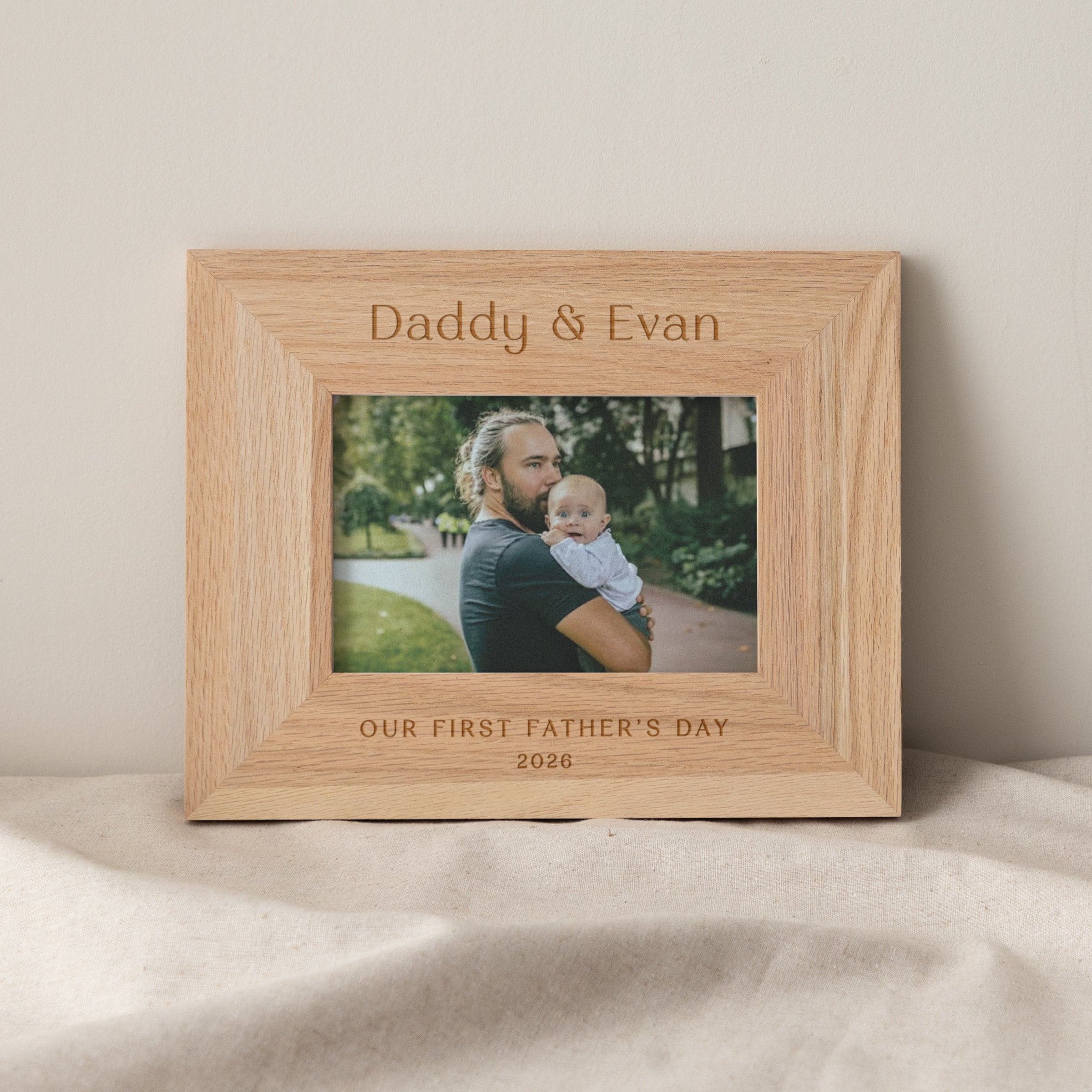 An engraved oak photo frame for Dad, the perfect gift for a first Fathers Day. This minimal design is perfect for any home to display a special memory with Dad.