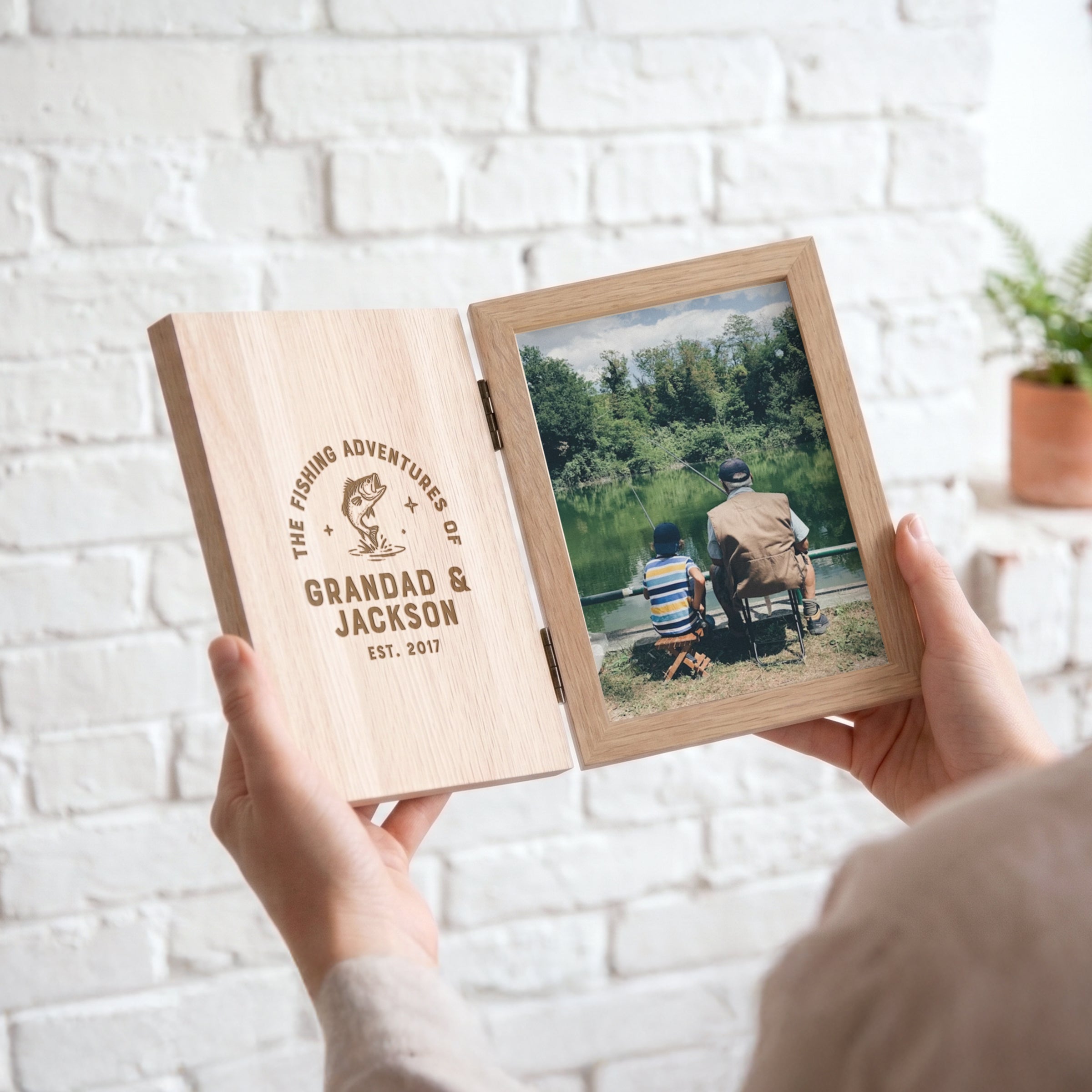 Our engraved solid oak book style picture frame for Father's Day, is perfect for capturing a special fishing trip with Dad and would be a great Father's Day fishing gift.