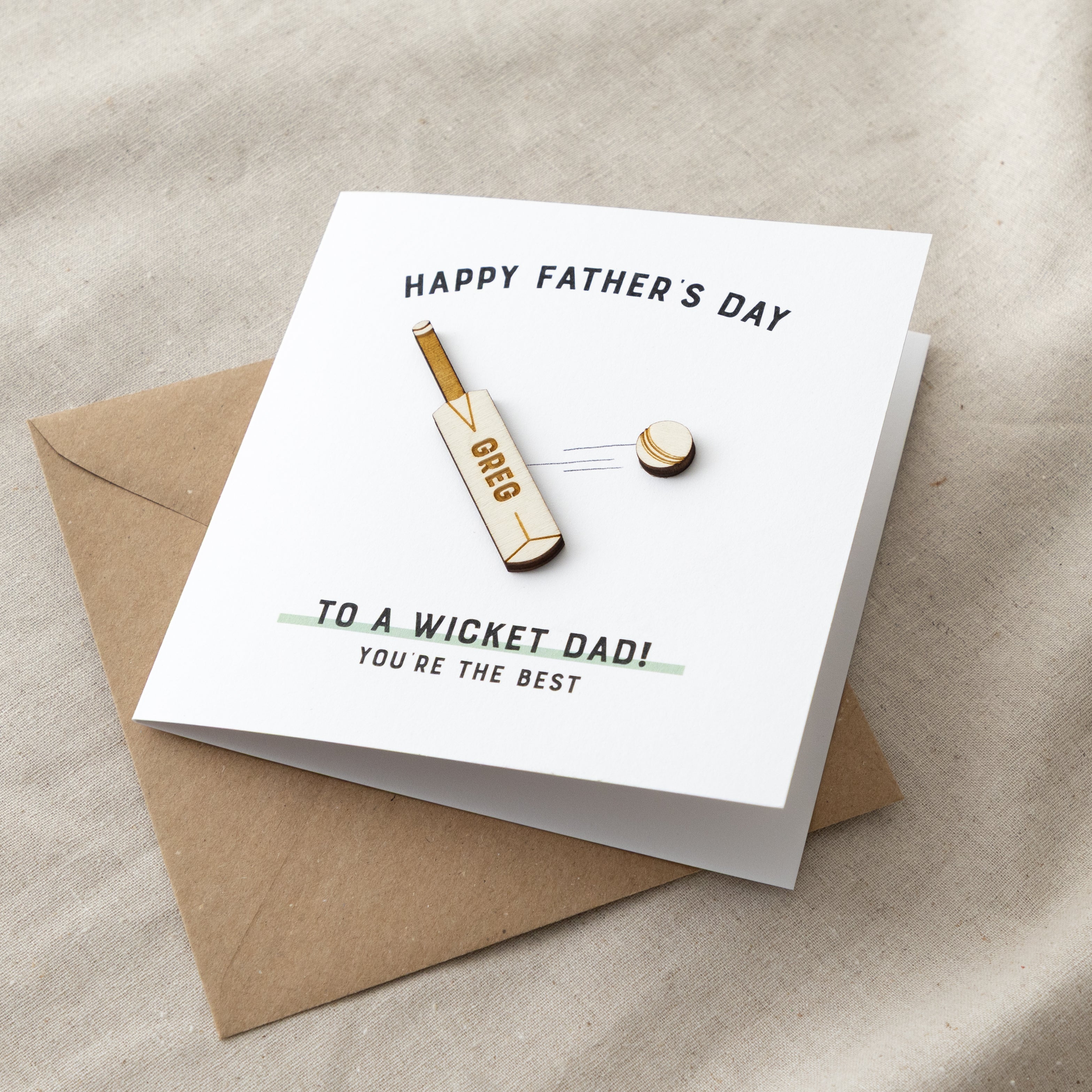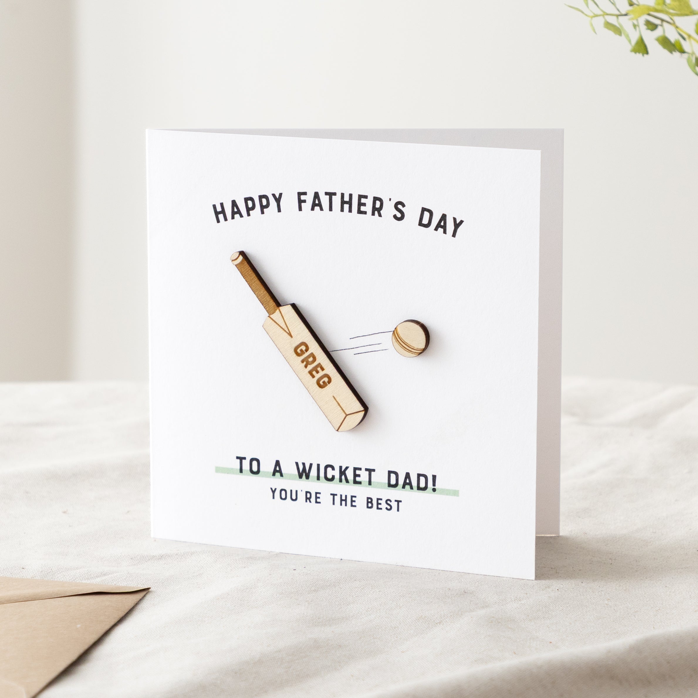 Our Personalised Cricket Father's Day Card features a wooden cricket bat, perfect as a cricket card for a Dad who loves sports.