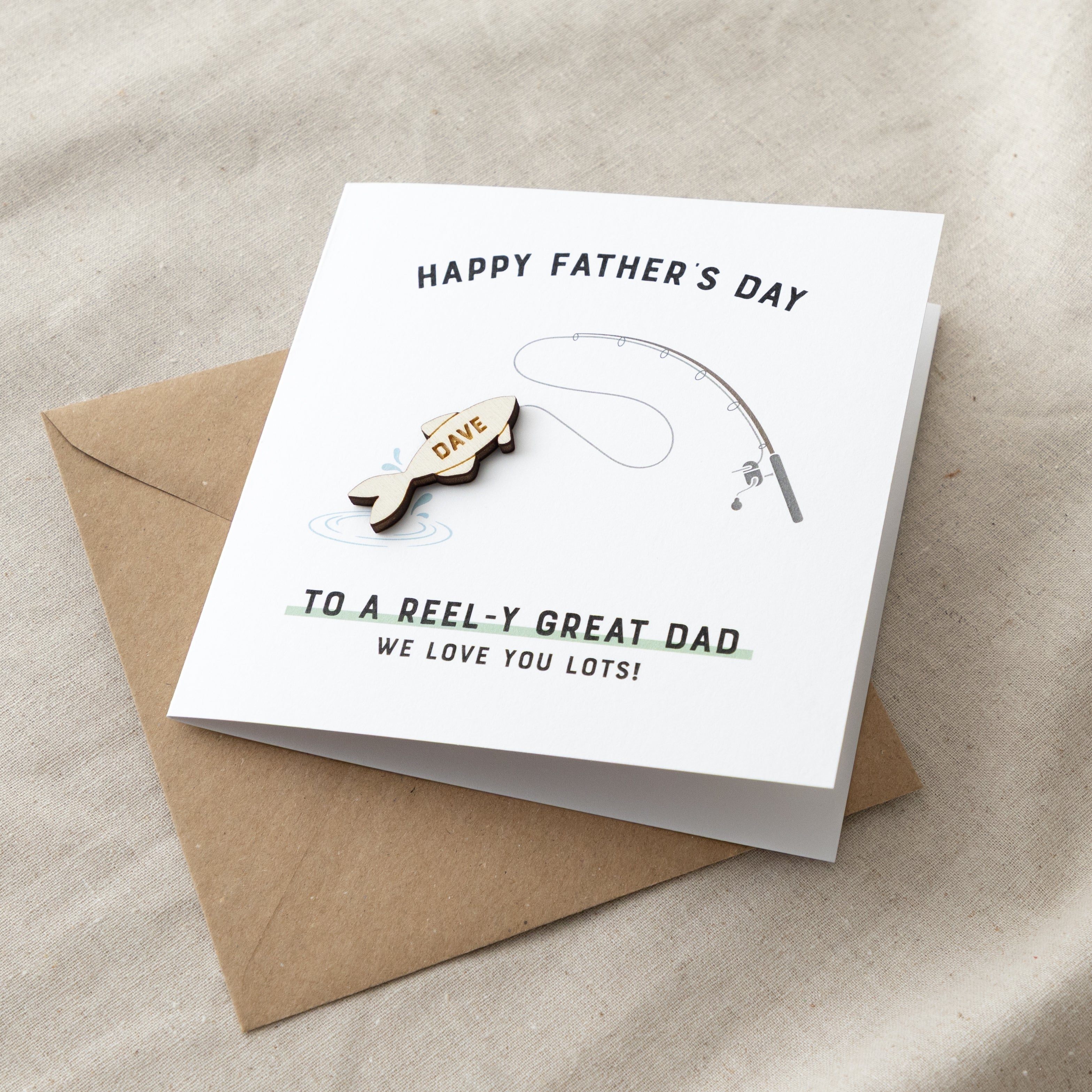 A personalised card is perfect for dad for Father's Day. With a wooden fish design, this keepsake card makes a great, fishing themed Father's Day card.