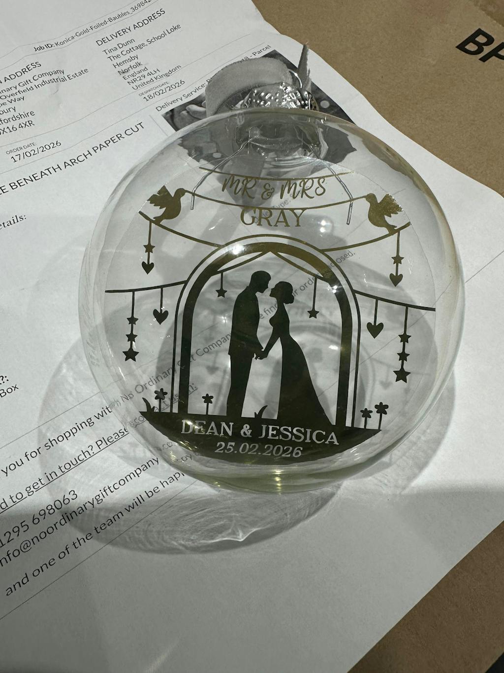 The design is printed in a metallic foil onto a clear polyester sheet, inserted into the bauble, which is finished with a velvet hanging ribbon in a choice of colours.