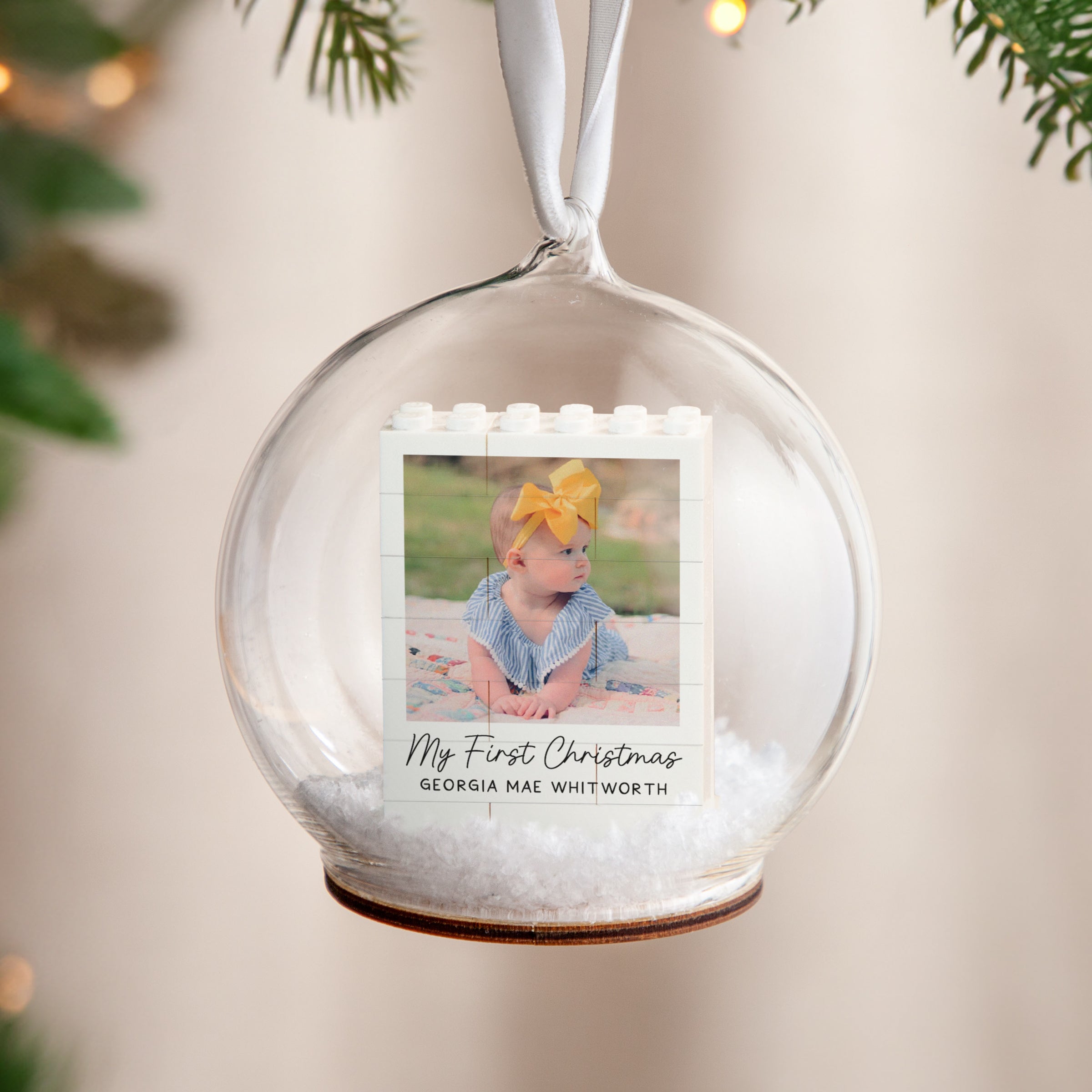 <!--td {border: 1px solid #cccccc;}br {mso-data-placement:same-cell;}-->A personalised First Christmas photo bauble featuring a block of 14 white genuine LEGO® bricks. Perfect for celebrating a new little one on the tree.The front of the blocks is customised with your photo and two lines of personalised text. This is backed with a white acrylic and fixed to a wooden base.The photo block sits within artificial snow, encased in a glass bauble. Baubles measure 10cm and are finished with velvet ribbon in your choice of colour.