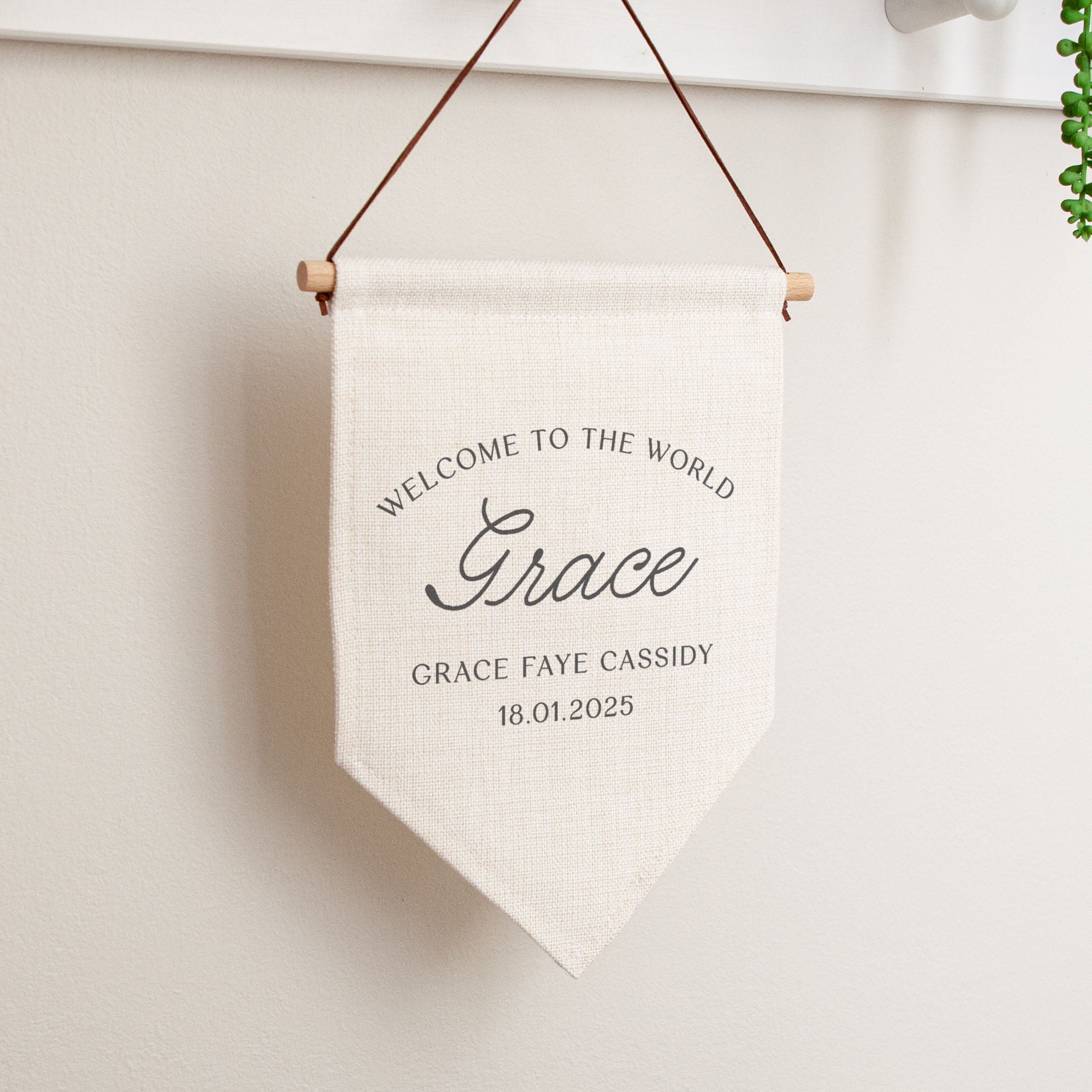 A personalised printed wall hanging, perfect for new parents. With a script name design, this decoration makes a unique keepsake to celebrate a new baby or as a Christening gift.