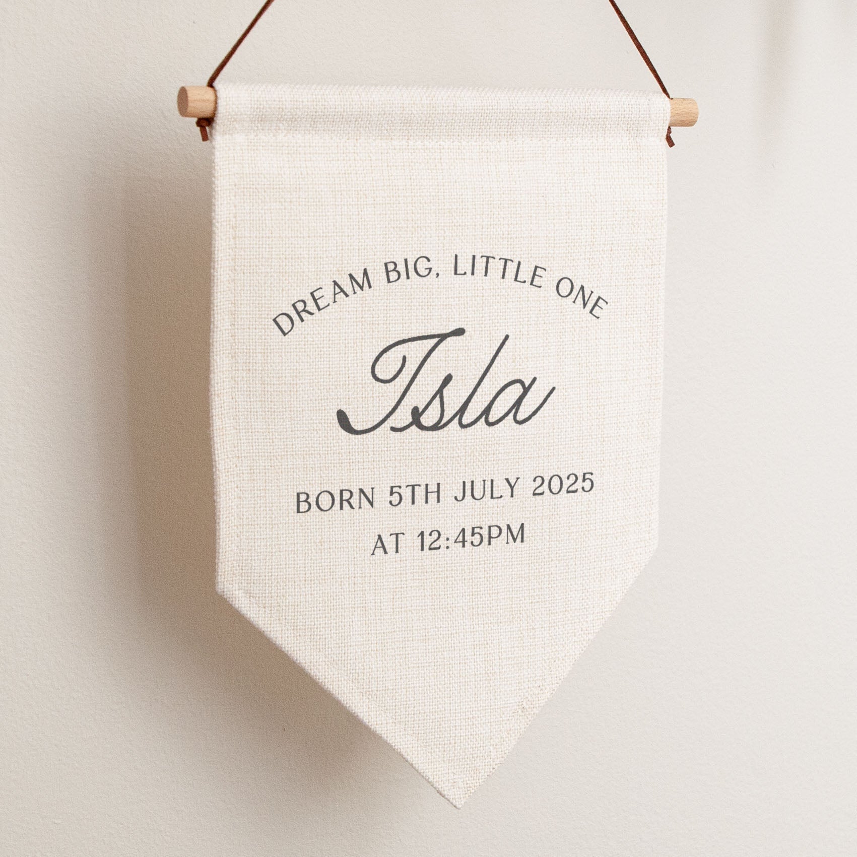 With a neutral linen fabric, printed with the child's details and hung with a brown cord and wooden rod, this is great to display in a little ones bedroom.
