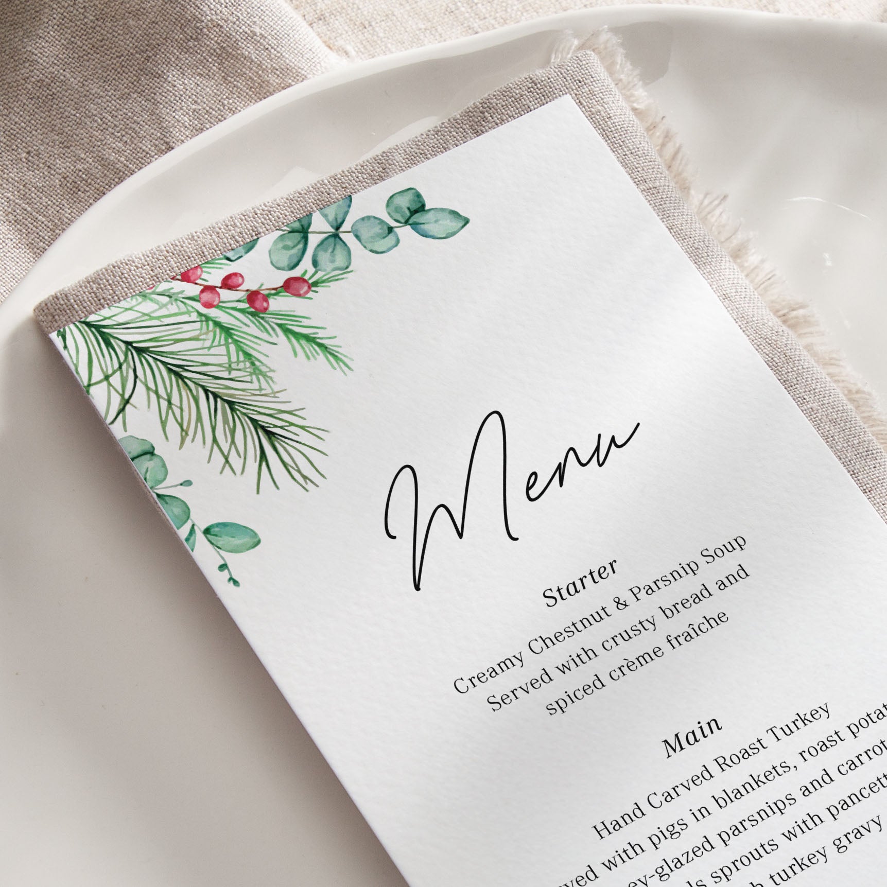 These cards are designed to be placed at each guest's seat or table, displaying your delicious menu options. This design features a festive leaf and berry illustration in the corners and matching folded place name cards are also available.