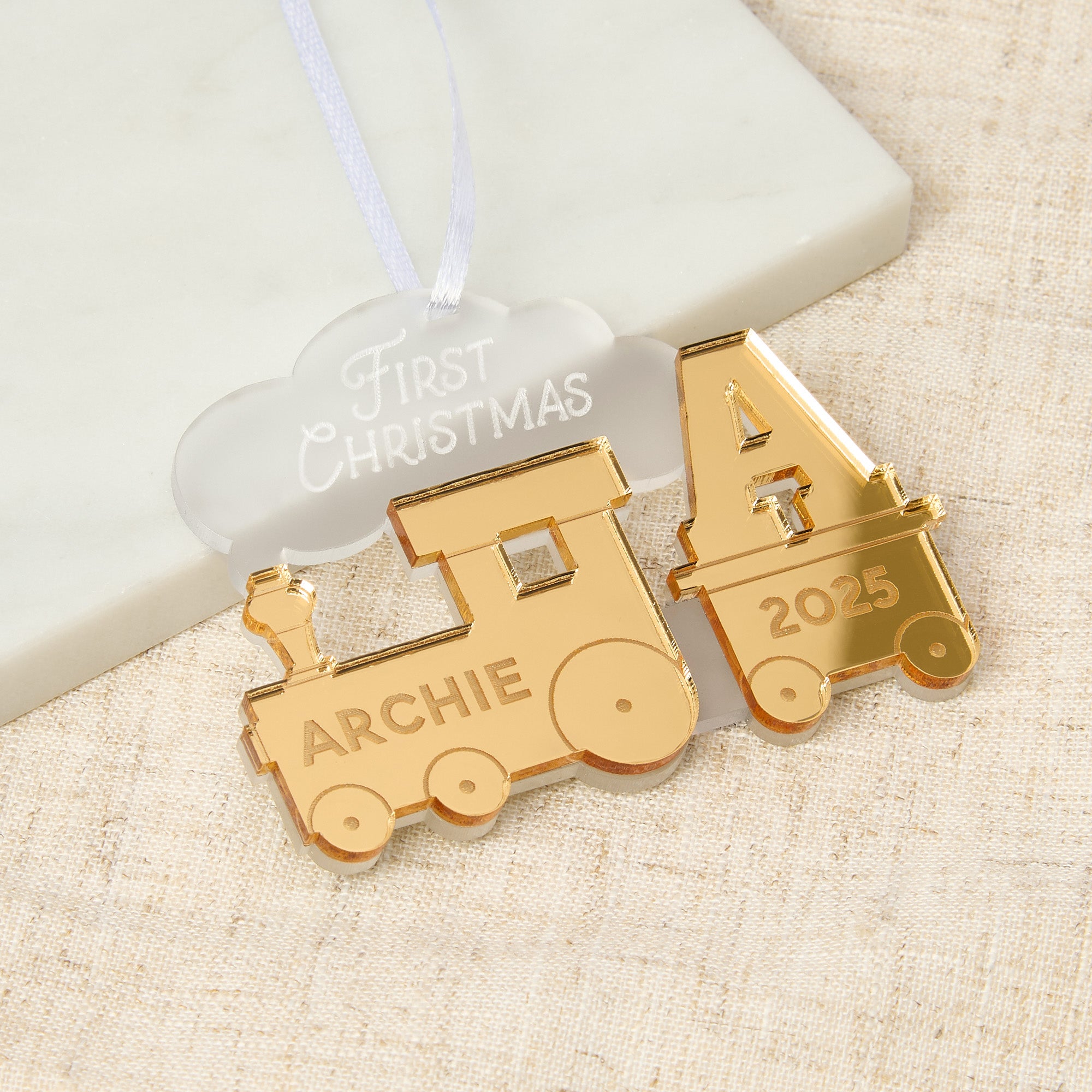Our first Christmas decoration features a cute mirror acrylic train with an initial carriage and frosted smoke, perfect for celebrating a new little one's first Christmas.