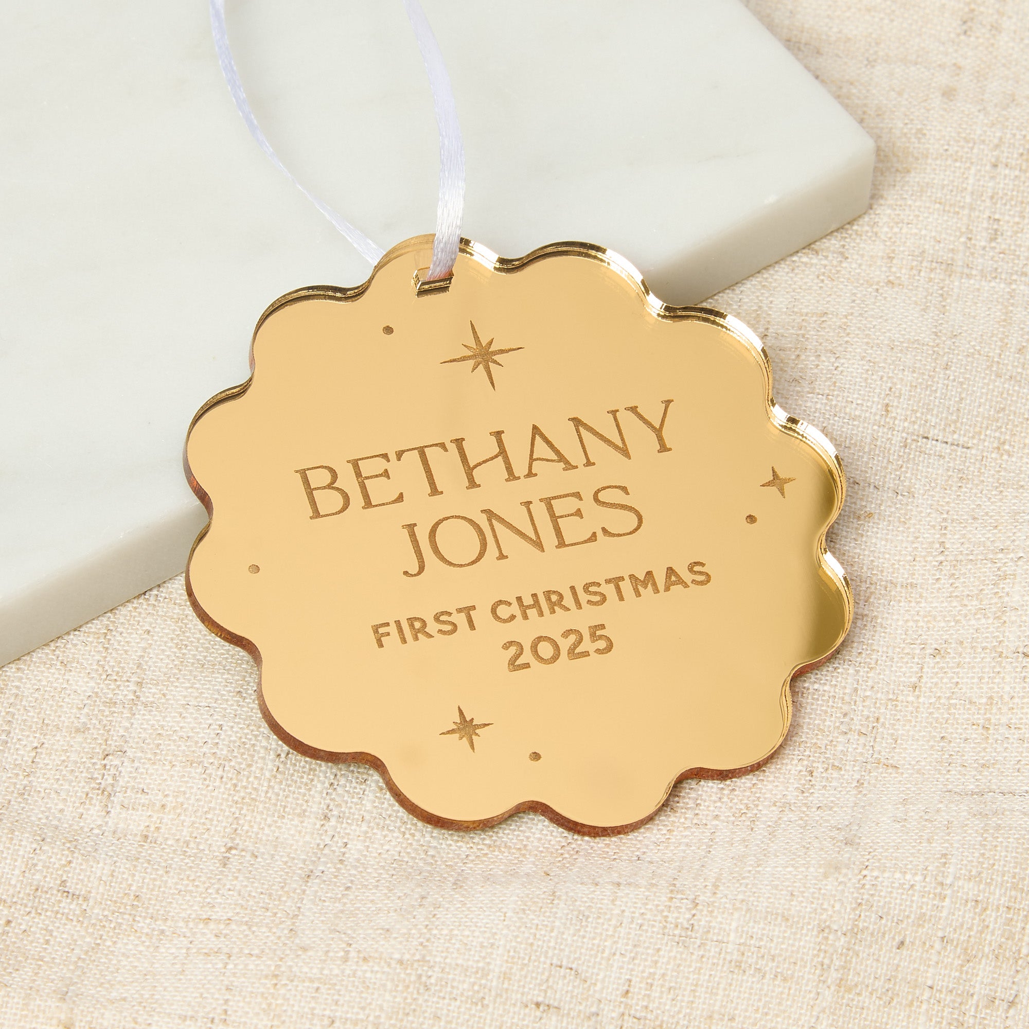 Our first Christmas decoration features a cute floral wiggle border design in mirrored acrylic, perfect for celebrating a new little one's first Christmas.