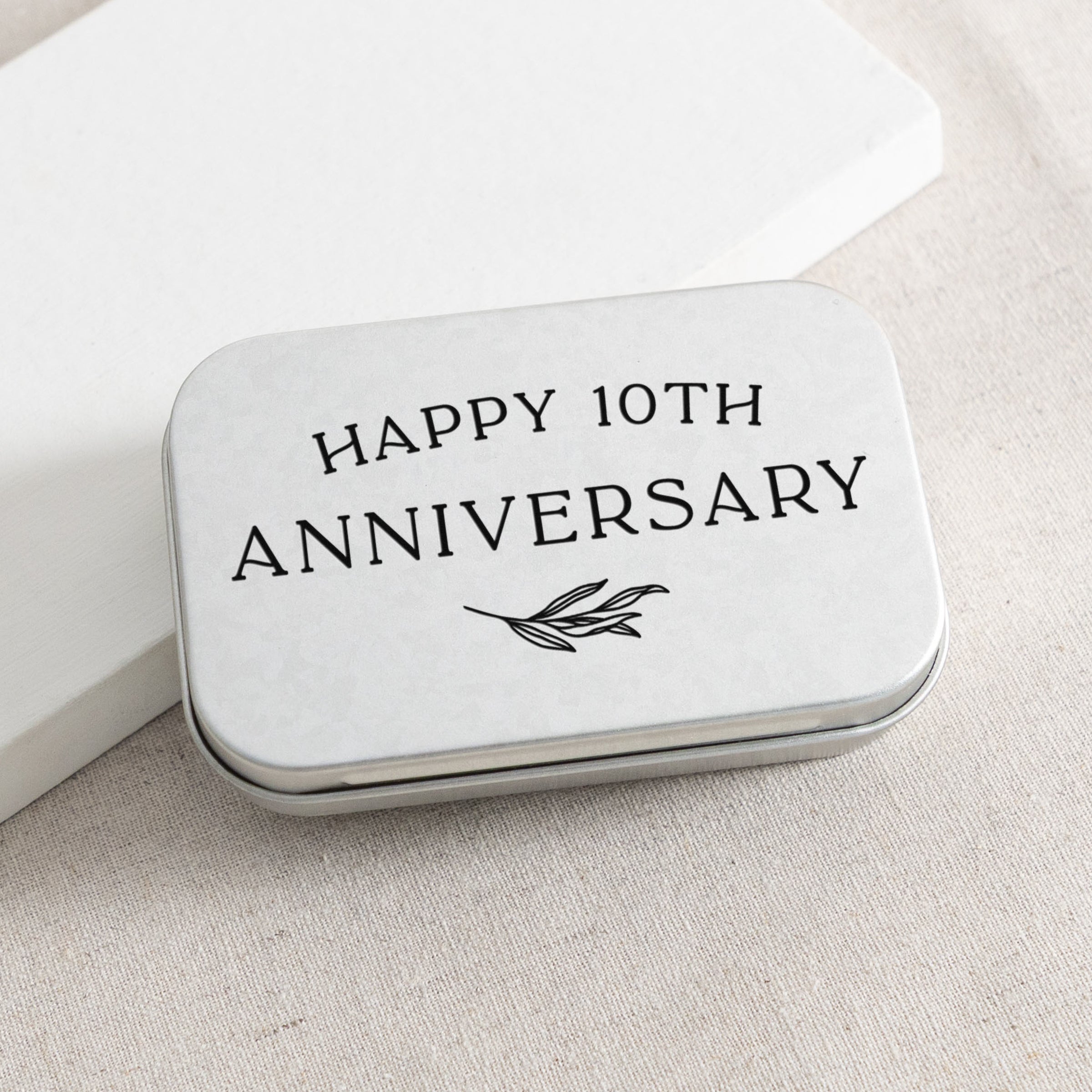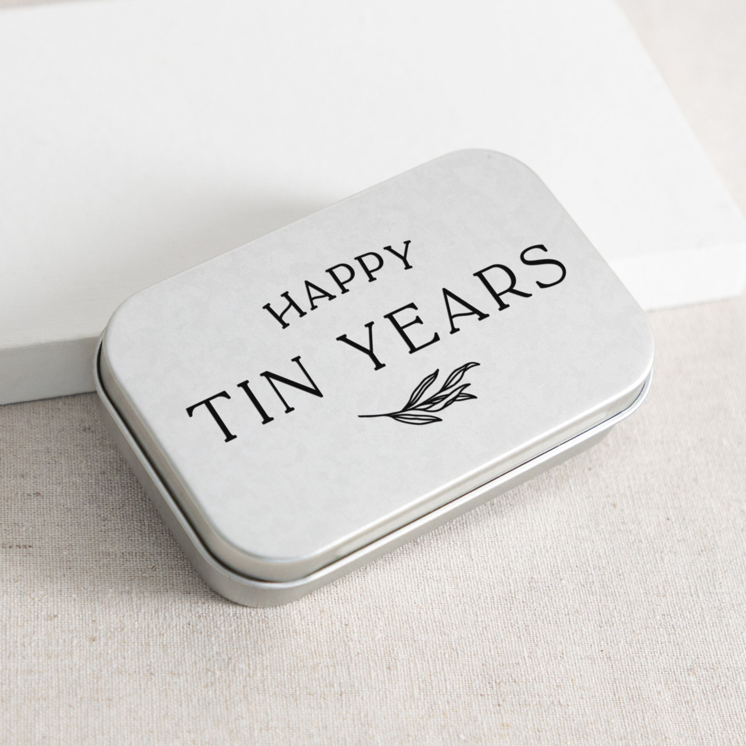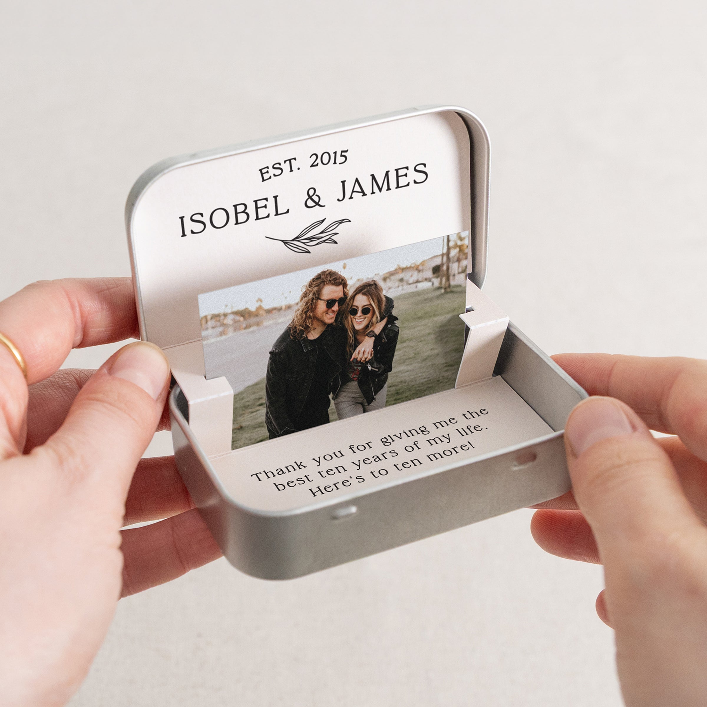 This personalised metal tin is the perfect token tin anniversary gift. Complete with a mini photo card as a special keepsake to carry with them.