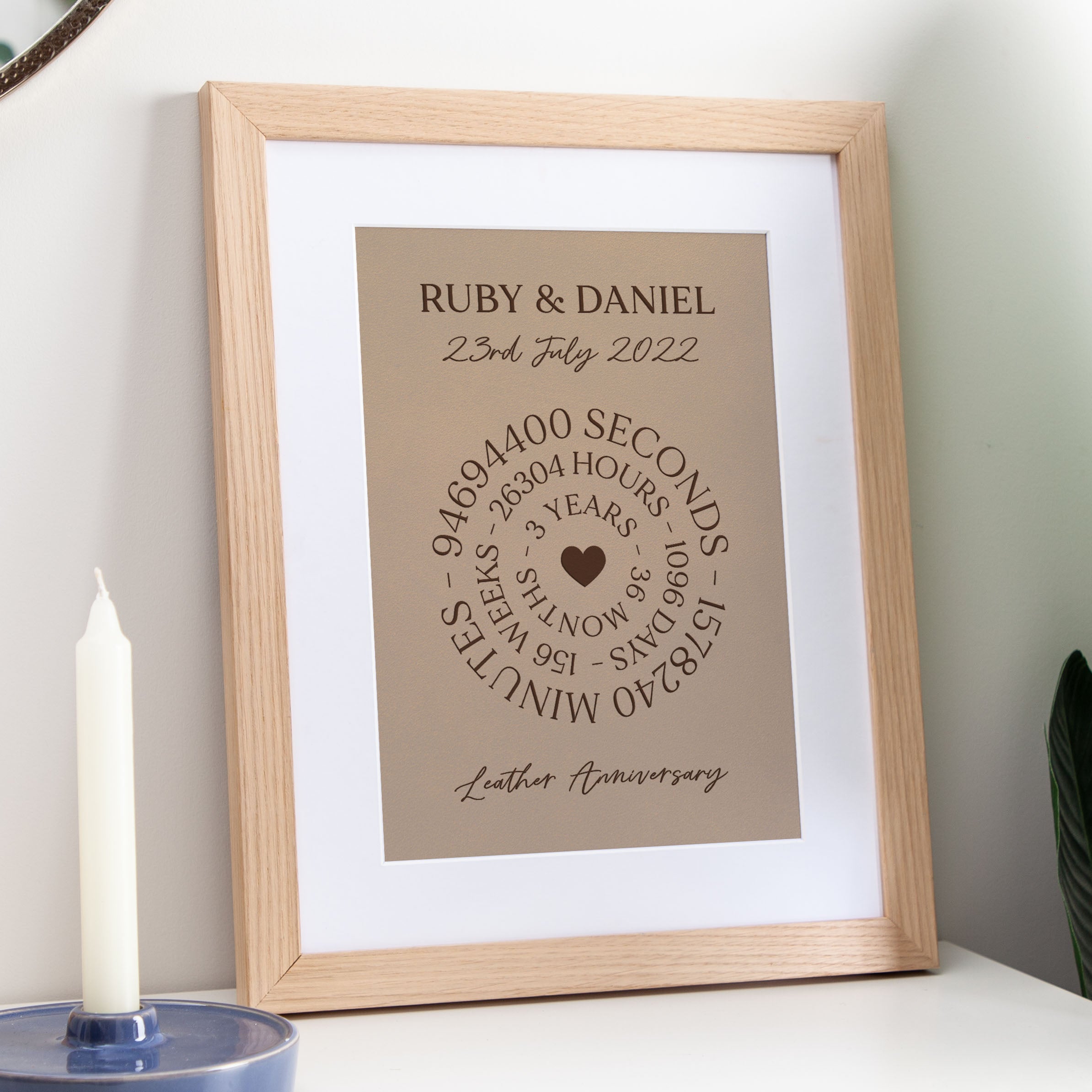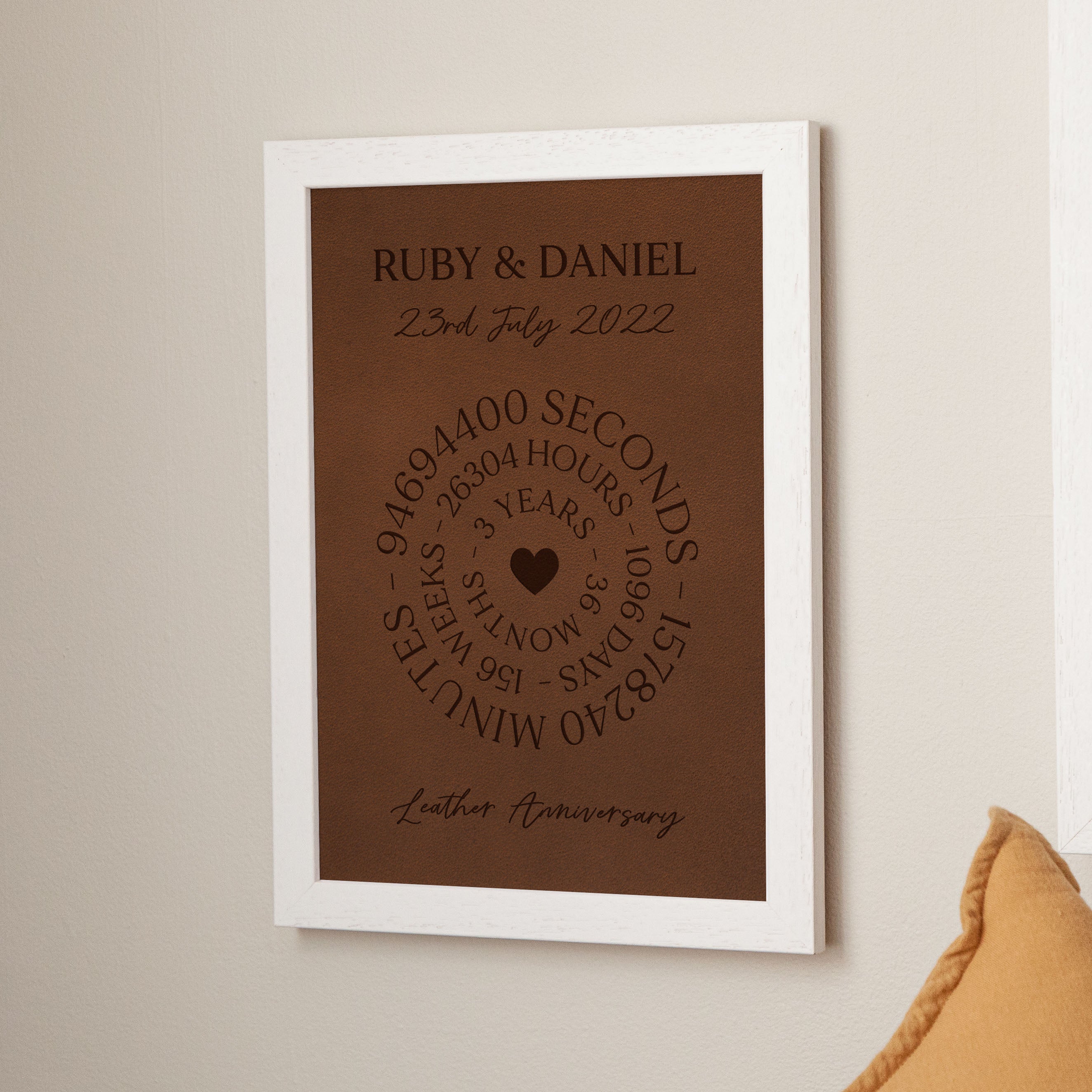 A personalised framed genuine leather print is the perfect gift for couples. With a 3 year time print design, this frame makes a great, personalised 3rd anniversary gift.