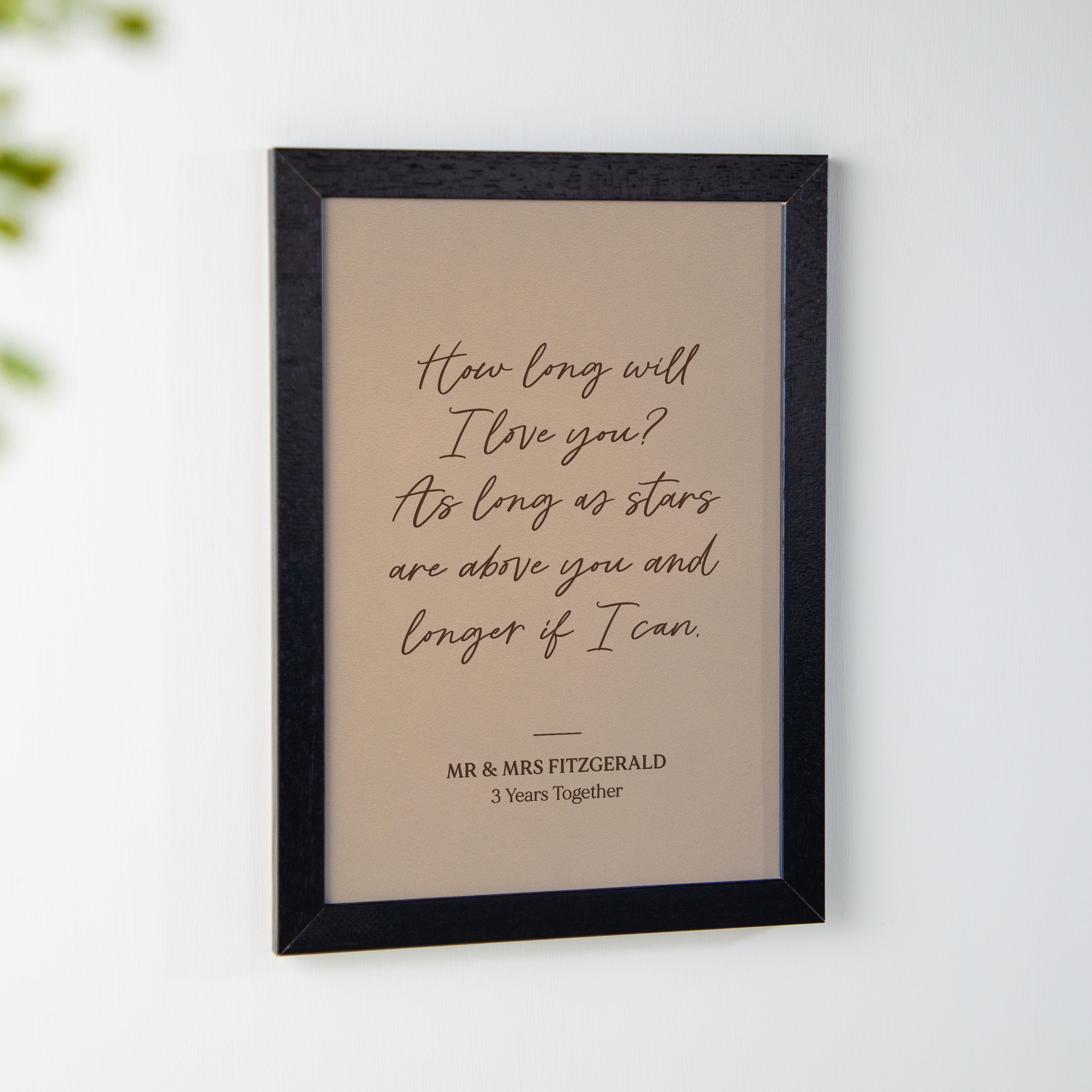 A personalised framed genuine leather print is the perfect gift for couples. With a custom wedding song or vows design, this frame makes a great, personalised 3rd anniversary gift.